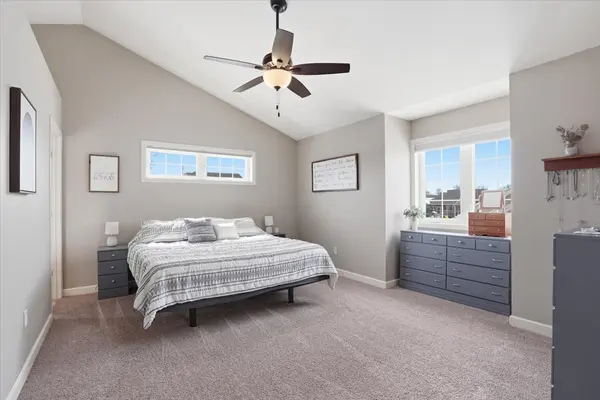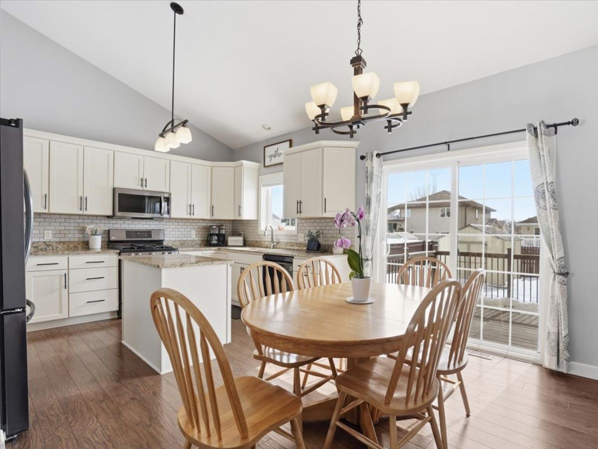 Step inside to discover vaulted ceilings and south-facing patio doors that flood the main living areas with natural light, creating a bright and inviting atmosphere. The open flow between the living, dining, and kitchen spaces makes everyday living and entertaining effortless.