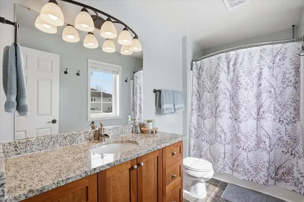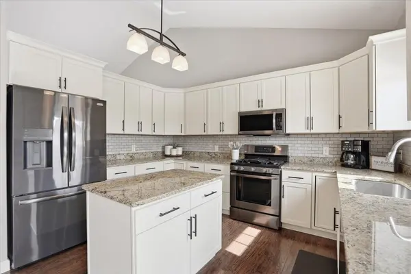 The kitchen is designed to impress with granite countertops, maple cabinetry, tile backsplash, and a center island, offering both style and functionality for cooking, hosting, and gathering.